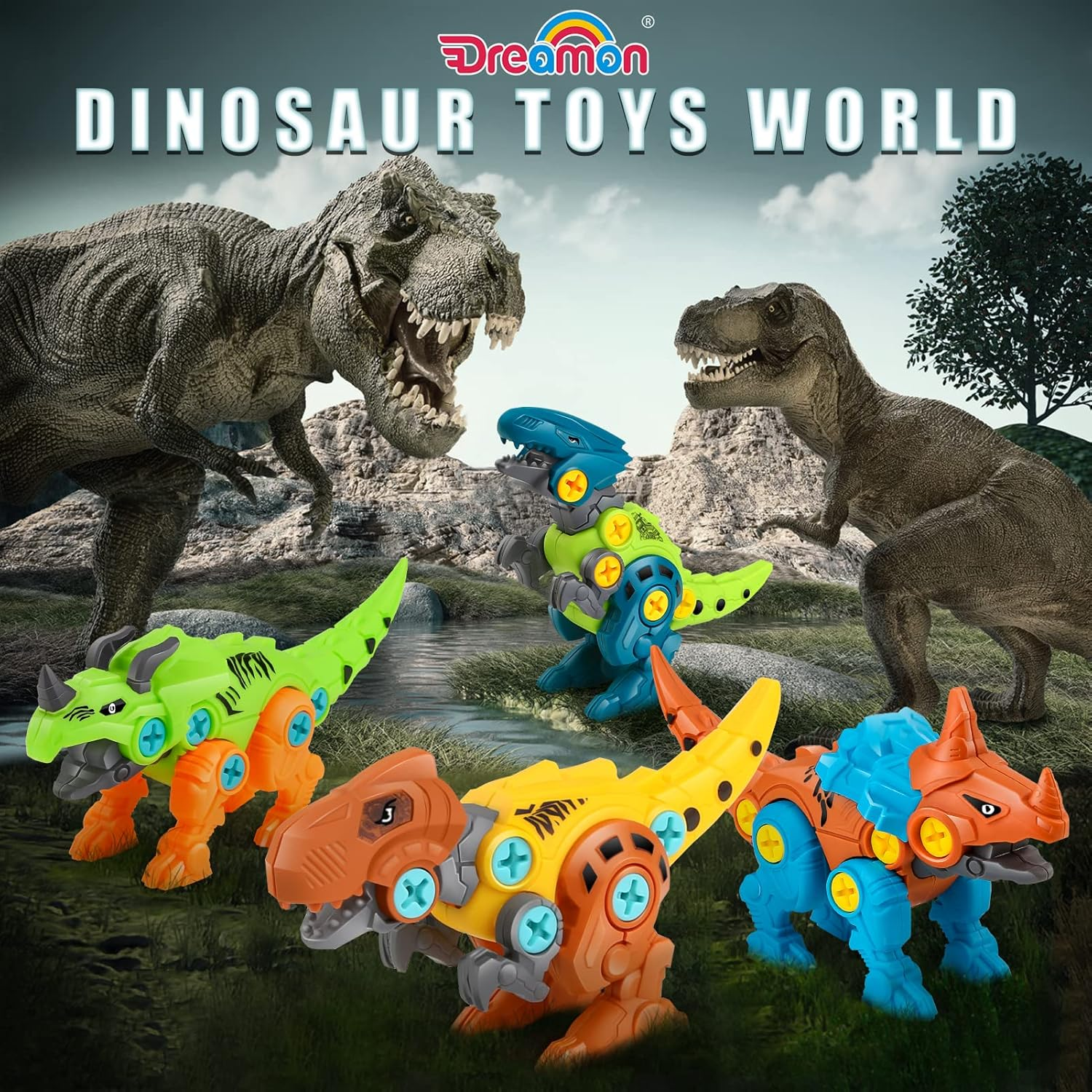 - [What You’ll Get in that Kids Toys] Dreamon dinosaur toys including Tyrannosaurus Rex, Centrosaurus, Triceratops, Velociraptor, screwdriver, electric drill and storage box. Take your children on a journey of dinosaur discovery.